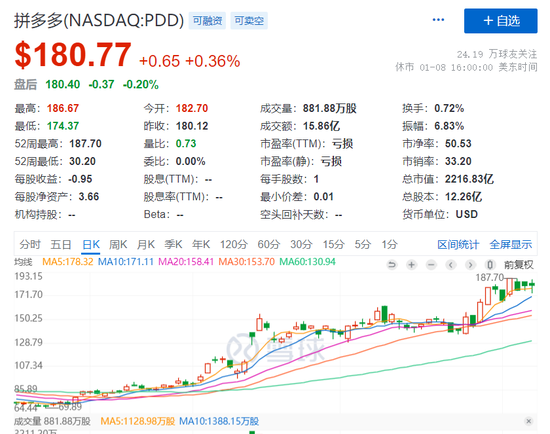 当天晚上,拼多多股价跌至166.78美元,下跌超过6%。1月5日拼多多股价再次暴涨,截至当日收盘股价大涨12%,总市值超2250亿美元,再创历史新高,并抹去4日的全部跌幅。