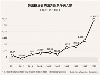 除此之外,去年韩国散户还加大了海外市场股票的投资。据韩国预托结算院(KSD)表示,截至去年12月28日,韩国投资者的国外股票成交额达1933亿美元,比2019年增长了近5倍,超过了2011年-2019年的总和。据悉,韩国人海外投资主要集中在美国,其次是中国和日本,而在欧洲的净抛售额达到了6657万美元。