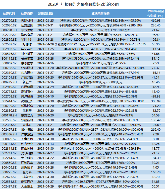 剔除扭亏公司,有36家公司预计2020年全年归属于上市公司股东的净利润最高增长超过2倍,其中,6家公司预计净利润最高增长幅度超过10倍。这些公司分别是天赐材料(002709.SZ)、达安基因(002030.SZ)、东方生物(688298.SH)、海欣食品(002702.SZ)、星网宇达(002829.SZ)、好想你(002582.SZ),2家医疗器械公司、2家食品饮料公司、1家化学制品、1家航天装备。
