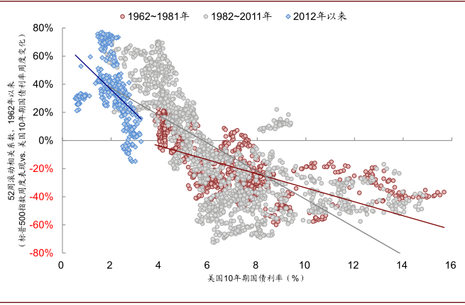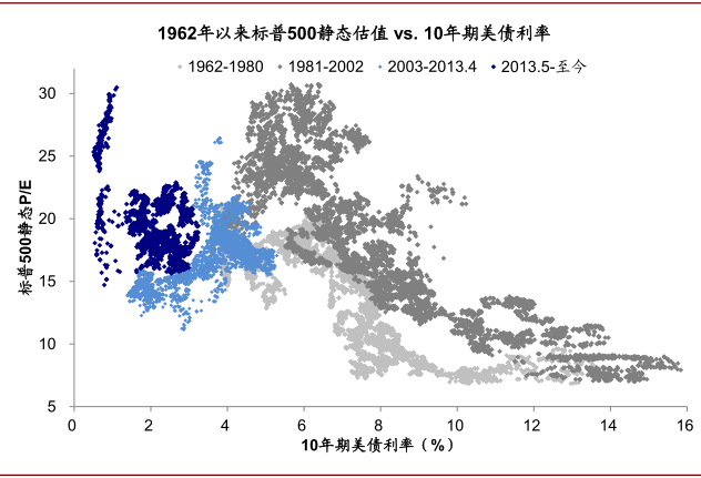 那这个阈值大概会是多少呢?但由于过去多年利率中枢持续下行,因此这一“阈值”也不断降低。1962~1980年,利率水平升至6.5%后估值逐渐回落,这一“阈值”在1981~2001降至5.8%左右,在2003~2013年4月降至4.0%左右,2013年后已降至2%附近,对应当前实际利率转正;2012年后的市场“阈值”在2.7%附近。