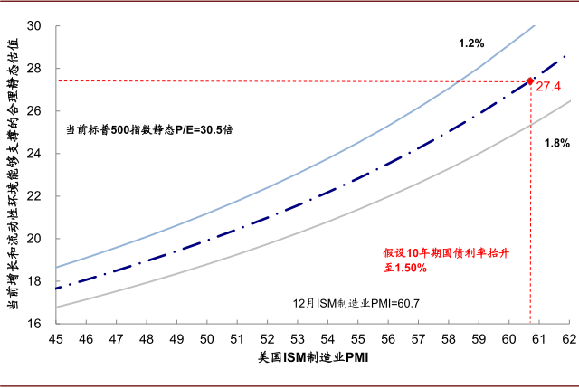 当然静态来看,基于我们的增长和利率决定的估值模型测算,如果假设制造业PMI基本维持在当前水平(12月ISM制造业PMI 60.7)不变,10年期国债利率如果升到1.5%,对应的静态估值约为27.4倍,较当前的30.5倍低10%左右,但如果风险溢价能够补偿一部分的话,那降幅将明显收敛。