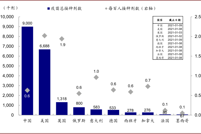 图表: 疫苗全球接种2350万;中国900万、美国669万、英国132万;美国接种加速,每天约42万