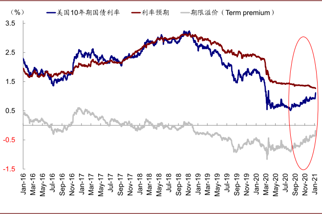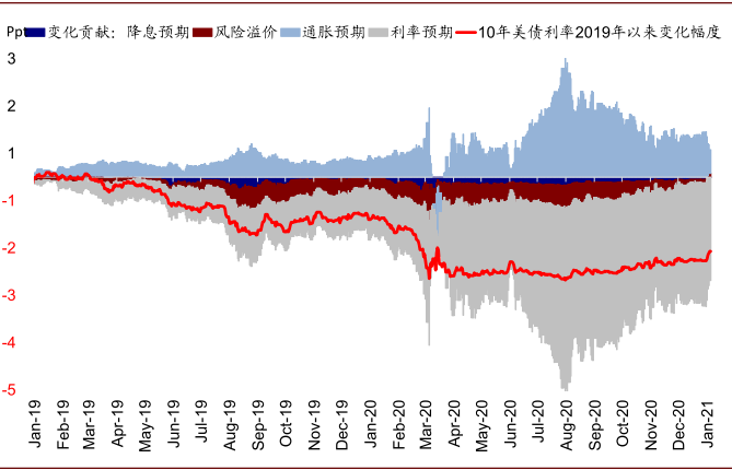 图表: 如果以风险中性利率和期限溢价(term premium)来划分的话,期限溢价则是主要贡献