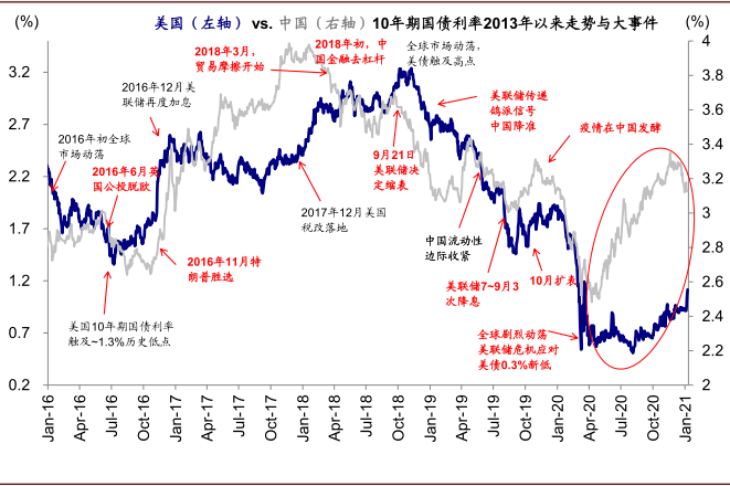 不过抛开短期波动,我们认为中期看10年美债利率仍有上行空间,主要理由为:1)美国当前依然稳健的需求和新增刺激、以及疫苗接种后复工的逐步修复(目前接种速度加快至每天42万剂,不排除拜登就任后进一步提速),从供需两个角度都可能推动长端利率继续走高,类似于中国2020年2~3季度情形,进而推动中美利差收窄。2)美国当前供需缺口依然很大甚至可能继续走阔的背景下,2021年上半年通胀走高也将给利率提供上行压力。3)美联储维持当前宽松力度的预期也已经充分计入,除非加大资产购买力度或实施收益率曲线控制,但目前看必要性不大。