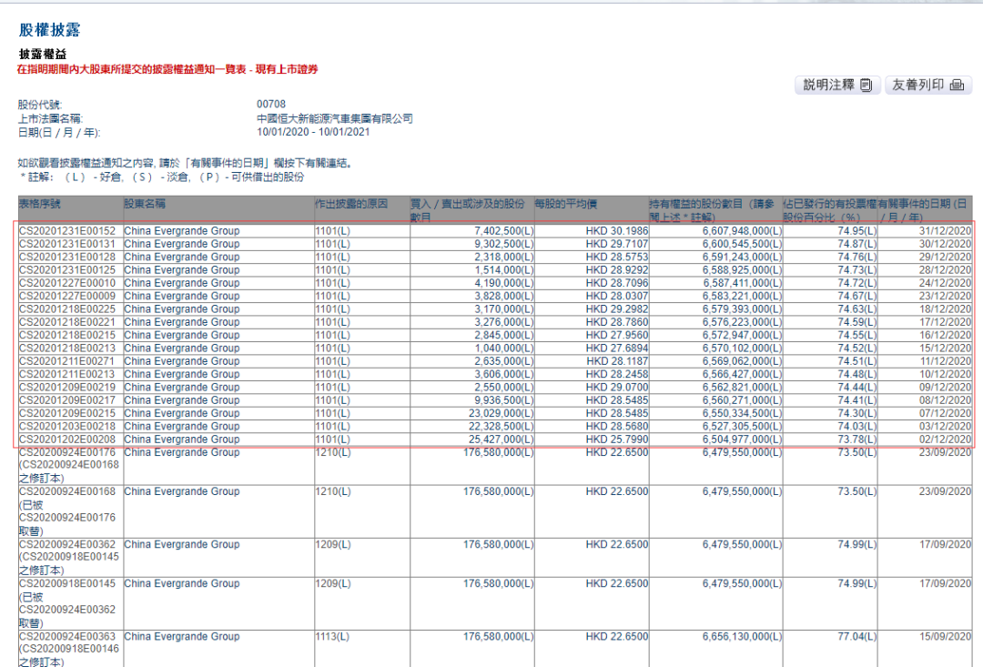 香港联交所最新披露资料显示,恒大集团从2020年9月23日之后一直没有动静,但是进入2020年12月,发动增持17次,涉资超过三十亿港元,持股比例直接从73.5%升至74.95%。