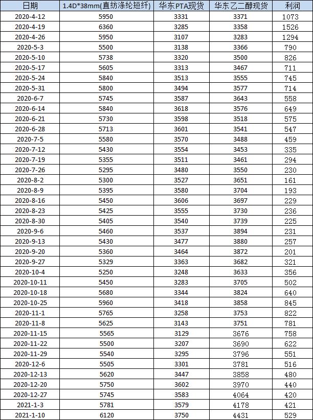 元旦前后,短纤市场产销十分火爆,在上周依旧有尚佳表现,刺激现货价迅速飙升。所以尽管原料亦有上调,但成本提升幅度不及现货,理论生产利润反弹至上月初以来最高。