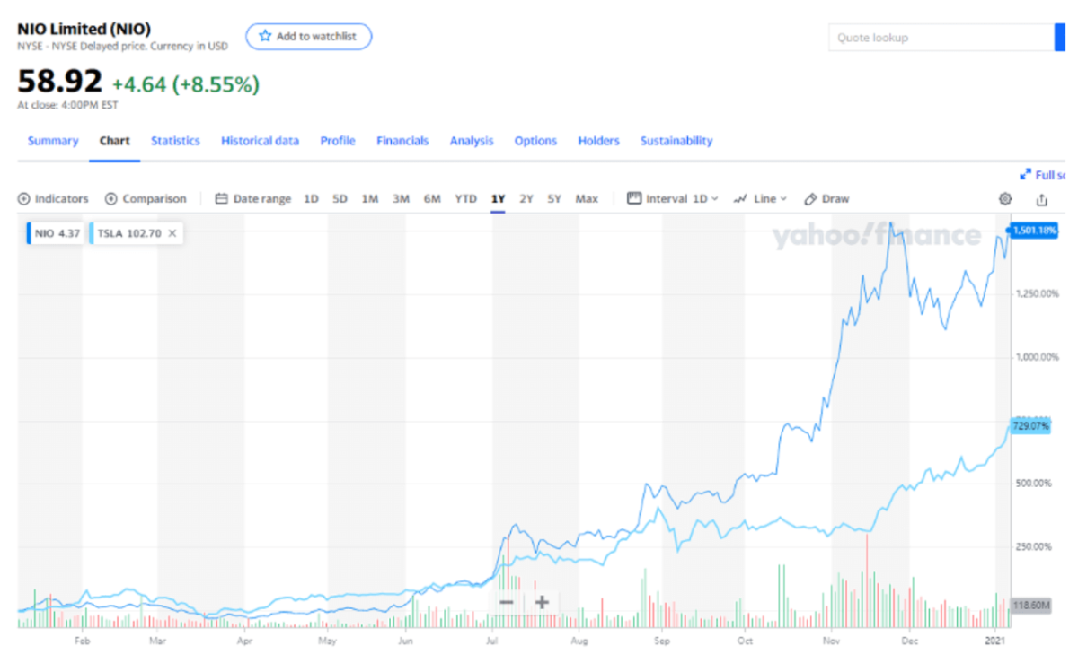 蔚来股价(深蓝色)与特斯拉股价(浅蓝色)
