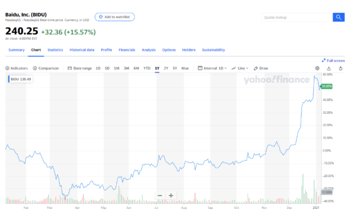 以上利好因素的叠加使得百度股价自12月以来涨幅超过50%。