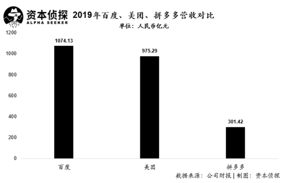 百度在2019年经营最困难的情况下,公司全年营收仍然超过1000亿元人民币——彼时的美团全年收入仅为975亿,而拼多多全年营收才刚过300亿元人民币。而进入2020年后,美团在后疫情时期率先迈入了2000亿美元市值俱乐部,位列AT之后成为互联网市值排名第三的公司;而拼多多则是在年中及年末分别跨过1000亿美元和2000亿美元市值大关,市值目前位列中国互联网公司第四。
