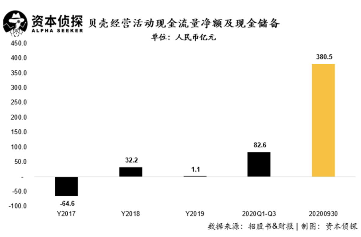 在现金流及现金储备上,贝壳在2018、2019年及2020年前三季度均取得经营活动现金流为正,同时截止2020年三季度末,现金储备超过380亿元人民币,财务健康程度持续提升。