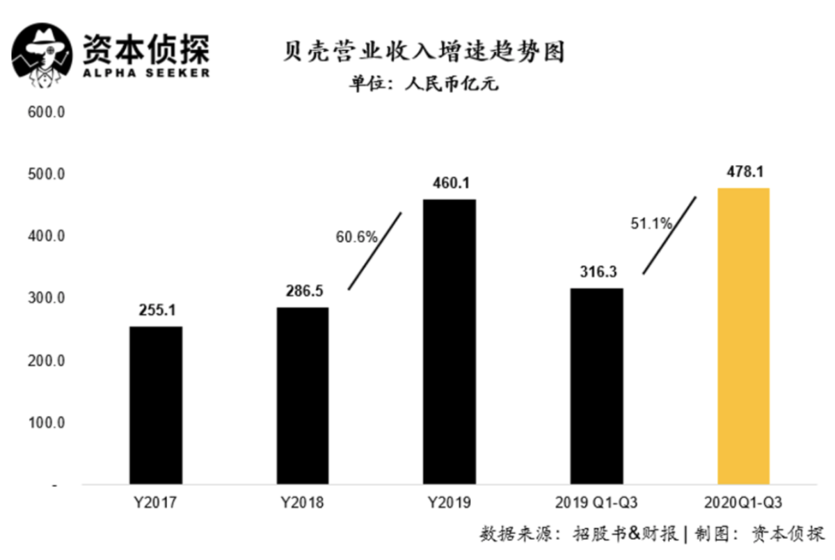 这一点从公司近几年的财务表现即可看出。根据贝壳招股书披露,公司2019财年取得营业收入460.1亿元人民币,同比大幅增长60.6%;而尽管在2020年疫情之下,房地产行业在疫情爆发严重的上半年经历了重挫,但贝壳在2020年前三季度即完成了去年全年收入,达到478.1亿元人民币,同比大幅增长51.1%。