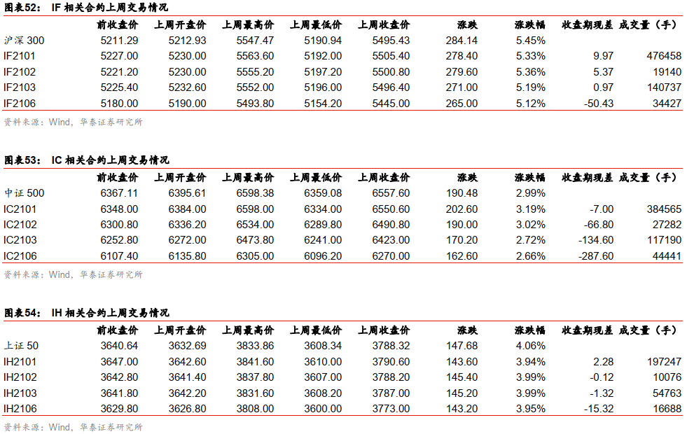 上周沪深300指数上涨5.45%,中证500指数上涨2.99%,上证50指数上涨4.06%。截至1月8日,IF当月合约期现差0.18%,下月合约期现差0.10%,当季合约期现差0.02%,下季合约期现差-0.92%。IC当月合约期现差-0.11%,下月合约期现差-1.02%,当季合约期现差-2.05%,下季合约期现差-4.39%。IH当月合约期现差0.06%,下月合约期现差-0.00%,当季合约期现差-0.03%,下季合约期现差-0.40%。