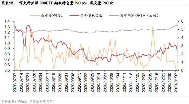 上周深交所300ETF期权成交量较前一周上升,日均成交量46.19万张,较前一周上升66.37%,认购期权日均成交量29.09万张,上升74.06%,认沽期权日均成交量17.11万张,上升54.74%。上周期权持仓量上升。截至1月8日,期权持仓42.15万张,与前一周相比上升36.65%,认购期权持仓22.75万张,上升43.94%,认沽期权持仓19.40万张,上升28.99%。期权成交量P/C比为0.51,与前一周相比下降23.65%,持仓量P/C比为0.85,与前一周相比下降10.39%。