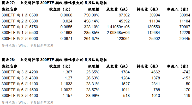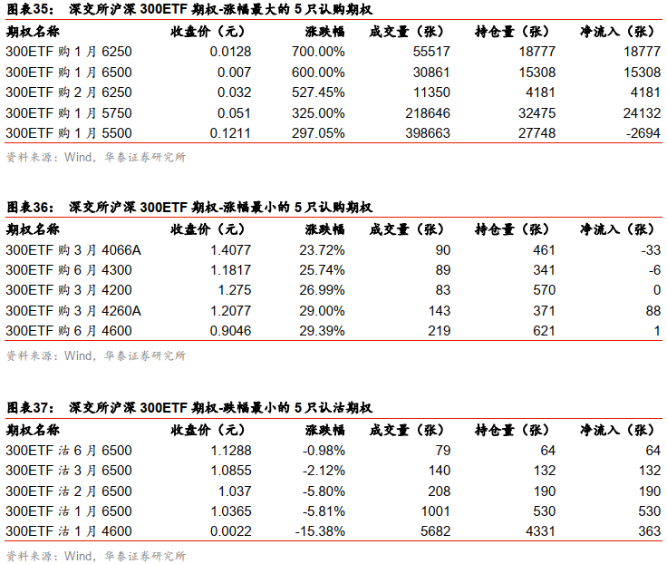 上周上证50ETF期权中,认购期权最大涨幅为500.00%,最大跌幅为5.60%;认沽期权最大涨幅为32.56%,最大跌幅为61.75%。上周上交所300ETF期权中,认购期权全部上涨,最大涨幅为750.00%,最小涨幅为25.65%;认沽期权全部下跌,最小跌幅为5.45%,最大跌幅为70.34%。上周深交所300ETF期权中,认购期权全部上涨,最大涨幅为700.00%,最小涨幅为23.72%;认沽期权全部下跌,最小跌幅为0.98%,最大跌幅为69.72%。上周沪深300指数期权中,认购期权最大涨幅为400.00%,最大跌幅为20.23%;认沽期权最大涨幅为42.86%,最大跌幅为91.84%。