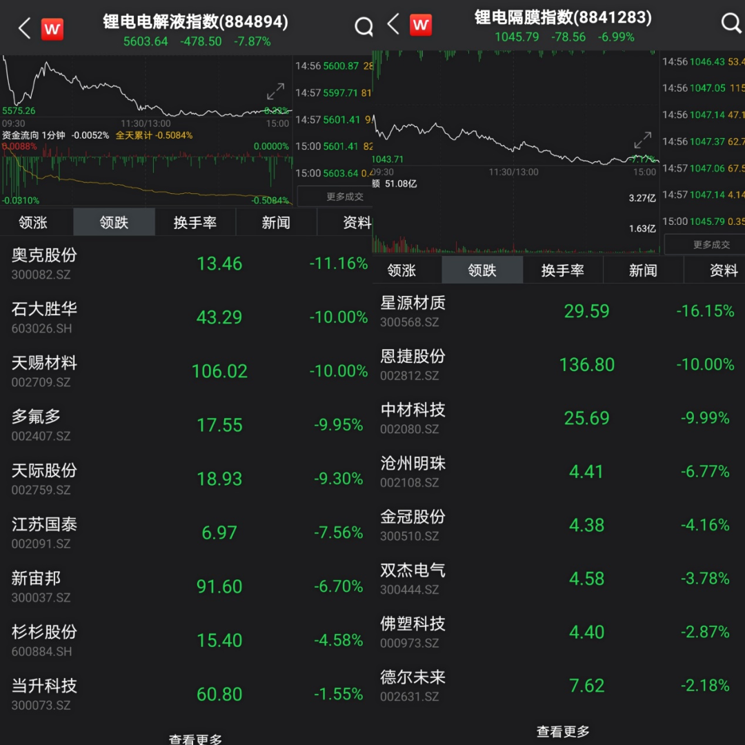 周一收盘,锂电隔膜、电解液个股全线大跌。星源材质跌幅16.15%,石大胜华、恩捷股份、天赐材料等多只个股跌停。