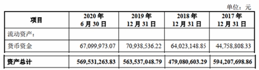 2017年末至2020年6月末,新亚电子资产总计分别为5.94亿元、4.79亿元、5.64亿元、5.70亿元,其中,货币资金分别为4475.88万元、6402.31万元、7093.85万元、6710.00万元。