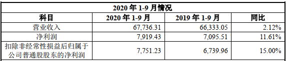 2020年1-9月,公司实现营业收入6.77亿元,较上年同期上涨2.12%;净利润7919.43万元,较上年同期上涨11.61%;扣除非经常性损益后归属于公司普通股股东的净利润7751.23万元,较上年同期上涨15.00%。