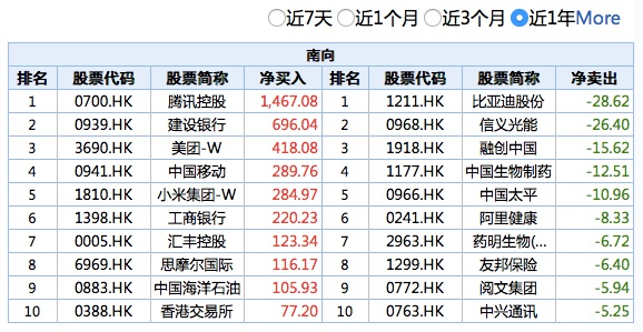 行业偏好上来看,南向资金更偏爱新经济和银行股。Wind数据显示,过去一年内,南向资金大举买入腾讯控股(00700.HK)1467.08亿元,买入建设银行(00939.HK)696.04亿港元。美团(03690.HK)、中国移动(00941.HK)、小米集团(01810.HK)也位居前列。