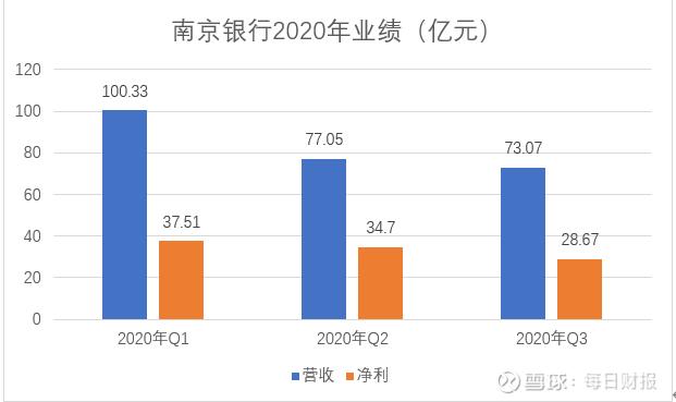 2020年一季度,南京银行实现营入100.33亿元,净利润37.51亿元;第二季度,该行营收为77.05亿元,环比下降23.2%,净利润为34.7亿元,环比下降7.5%。