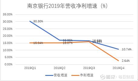 2019年第一季度至2019年第四季度,南京银行的营收增速分别为30.3%、16.95%、16.68%、10.74%;净利增速分别为15.04%、15.07%、15.95%、2.64%。