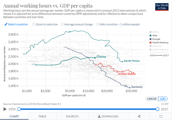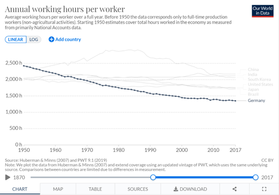 经合组织的数据可以追溯到1950年,当时德国(西德)的年平均工作时间是2427小时,比现在的中国更多。