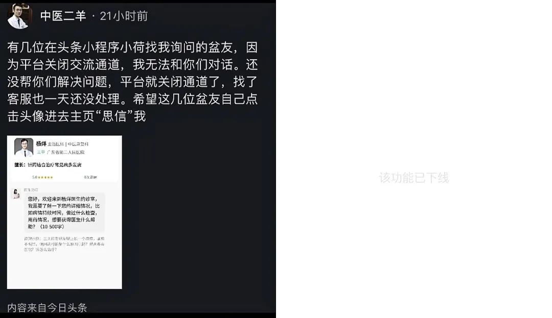 另据头条平台的一则医生动态显示, 头条的医患沟通功能出现问题,或许也是向小荷App及小荷医生App导流的表现。