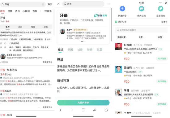 比如,用户在今日头条搜索某一种疾病,会出现由“小荷医典”提供的该疾病相关资料,在“小荷医典”中点击线上问诊服务就会跳转到小荷App的下载页面。