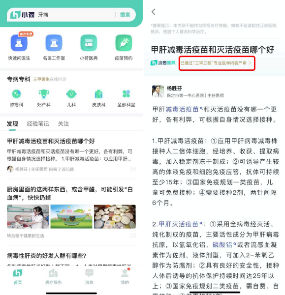 小荷App虽然有独立客户端,但也将今日头条App作为重要入口。在今日头条“小荷小程序”中,可以直接进行线上问诊、疾病自测和疫苗预约,但是更齐全的健康服务还是需要在小荷App体验。