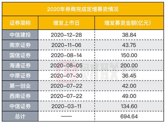2020年共有8家券商完成定增融资达694.64亿元,海通证券、国信证券、中信证券规模超100亿元,不仅名列券商定增募资前三名,也在A股上市公司定增募资金额前十之列。