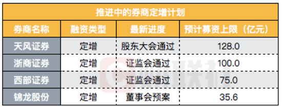 浙商证券2020年5月推出100亿元的定增计划,当年12月获得到证监会批复;西部证券2020年4月推出75亿元的定增计划,当年11月获得证监会通过。作为中山证券和东莞证券大股东的锦龙股份(维权),2020年8月推出35.6亿的定增计划。