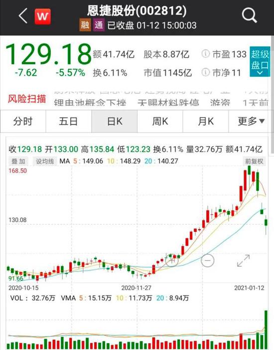 再看恩捷股份,该股搭上锂电大热的东风,去年12月以来股价连创历史新高。但本周一,公司股价突然高位跌停,当天龙虎榜显示,有3家机构席位现身卖出榜单,合计卖出2.04亿元,占当天该股成交总额的12.41%。