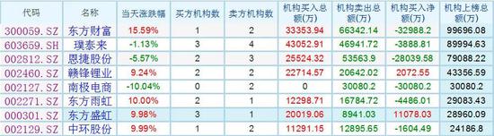 同样的,防水材料龙头东方雨虹周二虽然收获涨停,但卖出榜单出现1家机构席位大举卖出1.35亿元。璞泰来、恩捷股份、赣锋锂业、中环股份等新能源产业链相关个股,同日的龙虎榜上均出现了1亿元以上的机构资金抛售。