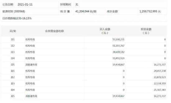 同样从事锂电池隔膜业务的星源材质,周一股价同样在历史高位发生巨震,当天股价剧烈下挫16.15%。盘后龙虎榜买卖前五罕见出现“零营业部”情形:4家机构席位现身买入榜单,合计买入1.76亿元;同时,4家机构席位现身卖出榜单,合计卖出9218万元。