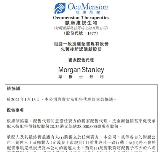 欧康维视生物:折让4.87%配股2800万股 大股东持股将减至42%