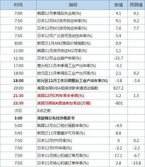 文华财经(编辑整理 李志伟)--周三,美国12月CPI数据将出炉;行业报告方面,美国EIA周度原油库存数据将公布。另外美联储将公布褐皮书。