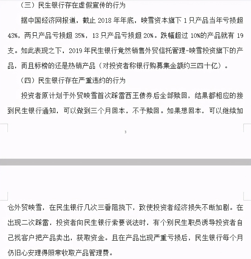 近日,多名投资者联合将民生银行投诉至银保监会,并发布了一封《关于对民生银行销售外贸信托-瑞智精选映雪债券专项产品联名投诉信》。这些投资者认为,民生银行在信托产品的销售过程中的诸多行为不当,误导了他们的投资,最终造成亏损。