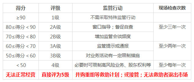 监管评级得分在90分(含)以上为1级;70分(含)至90分为2级,其中:80分(含)至90分为2A级,70分(含)至80分为2B级;50分(含)至70分为3级,其中:60分(含)至70分为3A级,50分(含)至60分为3B级;50分以下为4级;无法正常经营的直接评为5级。
