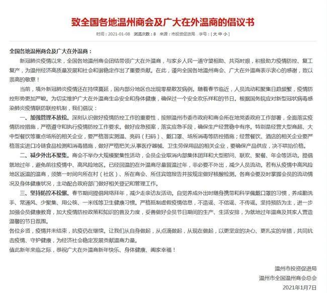 其官方微信公众号1月8日发布的《致全国各地温州商会及广大在外温商的倡议书》呼吁,全国各地温州商会不举办大规模聚集性活动,会员企业取消内部集体团拜和大型慰问、联欢、聚餐、年会等活动。提倡就地过年,避免前往疫情中、高风险地区。已经回温的在外温商尽量留温过年,非必要不外出,减少人员流动。若有从疫情中高风险地区返温的温商,须第一时间向所在村(社区)、所在商会、所住宾馆报告并按规定做好核酸检测。