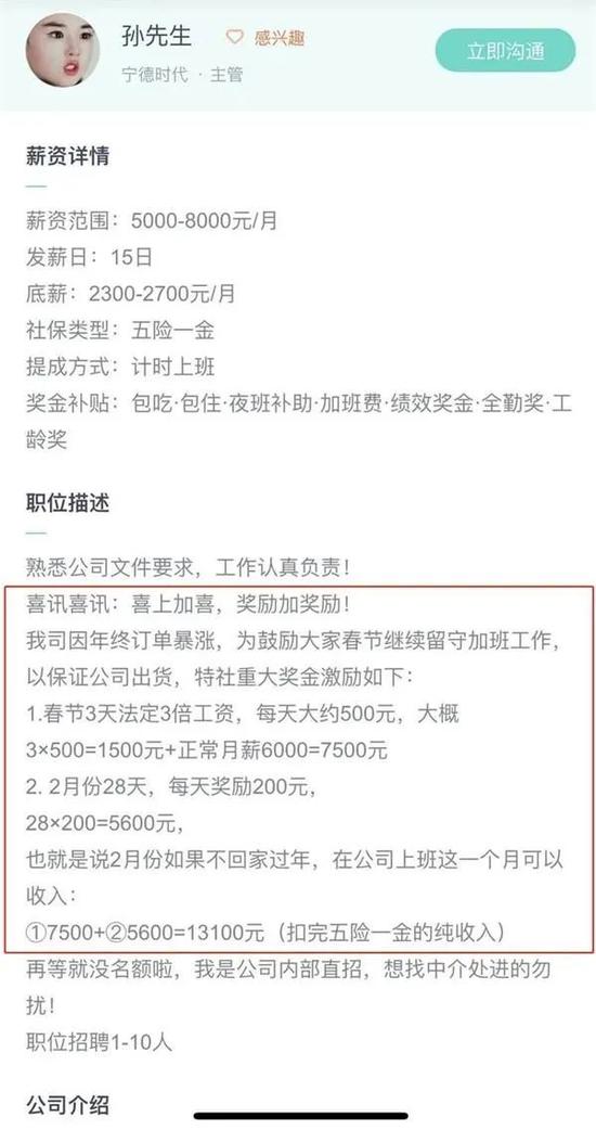 此前,宁德时代以高额奖金吸引工人留下加班,并在招聘中表示春节加班那个月有激励方案,不仅春节3天有法定3倍工资,2月份每天还额外奖励200元,即该月不回家过年,一线工人的纯收入将达到13100元。