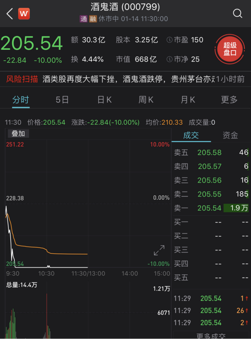 值得关注的是,在北京时间10:30左右,酒鬼酒一度撬开跌停板,但不到五分钟再度封板。