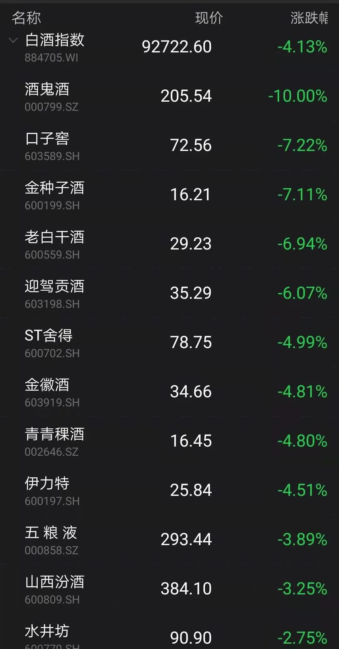 1月14日早盘,前期热门白酒板块表现疲软。截至午间收盘,酒鬼酒跌停,口子窖跌7.22%,老白干酒跌6.94%,五粮液跌3.89%,贵州茅台跌0.97%。