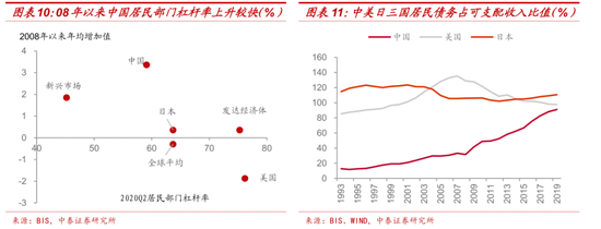 居民部门负债率快速上升,加杠杆空间有限。地产市场繁荣的背后是居民按揭贷款增加和部门债务率的快速上升,根据BIS统计,2008年末我国居民部门杠杆率还不到20%,12年间上升到接近60%,年均增速超过3个百分点。目前杠杆率尽管低于发达经济体,但明显高于新兴市场国家平均水平。如果用居民债务占可支配收入比重这一指标衡量,横向对比看,美国在金融危机期间该比值一度突破100%,2019年已降至97%,债务压力较大的日本也仅为110%,而我国2019年已经超过90%,进一步加杠杆的空间较为有限。
