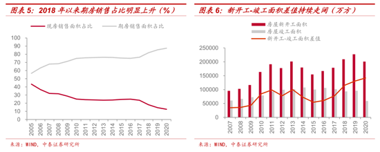 融资监管不断趋严,开发商被迫“高周转”。2016年10月起,包括限制发债资金用途、打击非标、规范前融、“三道红线”等一系列政策先后落地,开发商资金来源逐渐侧重于经营性融资。房企拿地后抢开工,尽早达到预售条件、加快资金回笼的同时忽视后期施工和竣工环节。这也导致2018年以来期房销售比例提高至近90%,新开工面积与竣工面积的差值连续四年走阔。2016年以来,定金及预付款、按揭贷款占资金来源的比重明显上升,分别超过34%和15%。