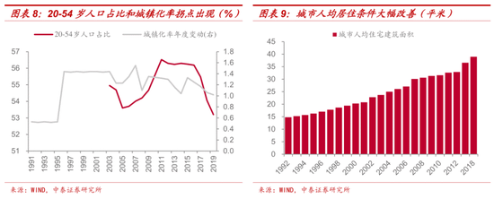 人口结构和城镇化率拐点已经出现。2016年以来,我国城镇化推进速度逐渐放缓,20-54岁人口占比见顶回落,同时2018年城市人均住房面积已达到39平方米,达到部分发达国家水平。参考国际经验,房地产市场已经进入降速提质时代,行业销售和投资将趋势性下行。