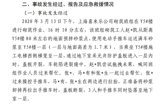 2020 年 3 月 13 日下午,上海喜来乐公司砌筑班组在 Y5#楼 进行砌筑作业。16 时 10 分左右,该班组砌筑工人赵*凯从距离 Y5#楼 80 米左右的地面预拌砂浆点,使用电动手推车运送满车砂 浆至 Y5#楼一层(一层与地面高差为 1.7 米),当乘坐 Y5#楼施 工电梯西侧梯笼至一层,通过地下室采光井防护盖板进入一层内 时,盖板开裂,车轮陷进裂缝中。赵*凯尝试拖拽未果,喊同班 组作业人员过来帮忙。张*、马*有和张*生一起过去帮忙,张* 过来操控手推车,马*有、张*生在两边进行拉抬,正准备将砂浆 卸掉再拉出手推车时,盖板断裂,3 人和手推车同时坠落至地下 室一层。