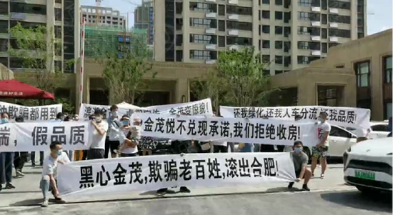 而另外,据资料显示,早在2020年6月,便有购房者爆料,合肥滨湖金茂悦项目便因虚假宣传,欺骗消费,房屋质量不达标等一系列问题惹怒了全体业主,爆发了大规模横幅事件。