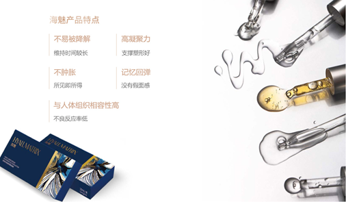 “海魅”具有无颗粒化、高内聚性的特点,注射后不易变形移位、不良反应发生率极低,安全性高。采用新型无颗粒化交联透明质酸凝胶的制备方法,具有良好的生物相容性,能够维持两到三年的时间,不易被降解,所以维持时间长。将带给求美者全新的体验和选择,同时也满足医生更精细化的技术要求。