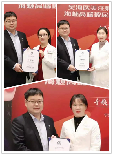 昊海生科代表为宁波美莱授牌,宁波美莱正式成为海魅玻尿酸宁波地区首发授权注射机构。同时,林华芬、沈露芳、吴雅娜医生被授权为海魅玻尿酸“2021年度官方指定注射导师”。