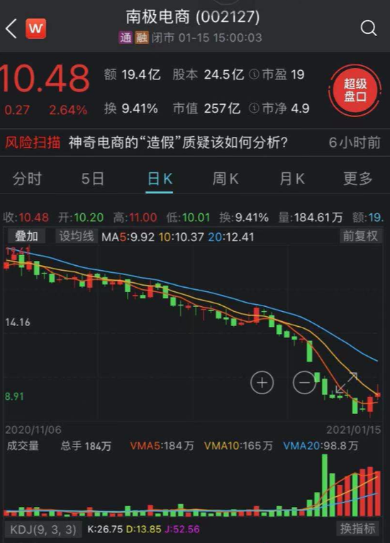 南极电商股价1月15日上涨2.64%,报10.48元。最近10个交易日股价跌逾23%。