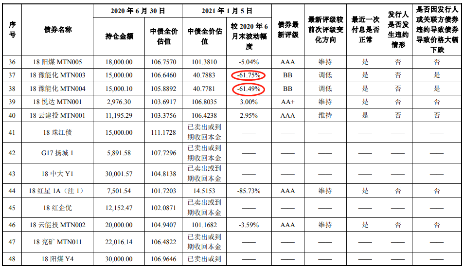 公告称,考虑到“20永煤SCP004”50%本金回收率以及其他3项债券50%的预期本金回收率,该4项债券的中债估值均已低于预期可收回金额,2021年上述4项债券中债估值进一步大幅下跌的可能性较小。
